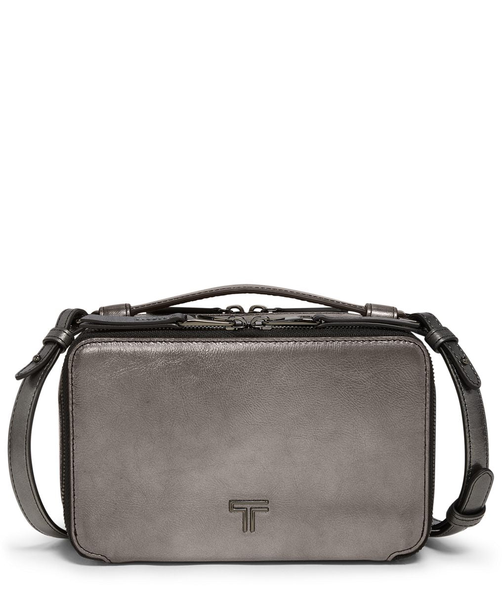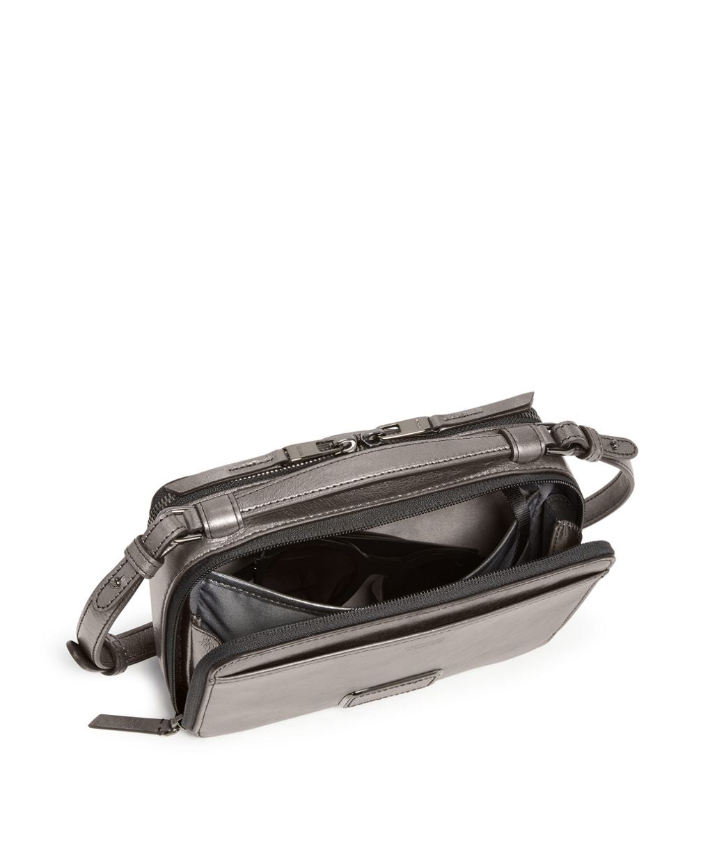 In metallic leather, this structured crossbody is a festive and compact choice for everywhere you go this season. Find two interchangeable straps, card slots and space for your essentials inside.