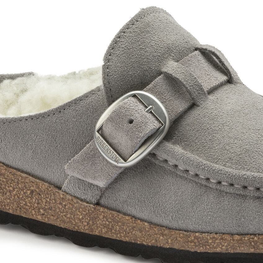 The BIRKENSTOCK Buckley is a semi-open moccasin-style clog that’s instantly recognizable as an authentic BIRKENSTOCK original thanks to its exposed cork footbed. Here, the classic model comes in a particularly cozy version with genuine shearling and a statement buckle. The perfect shoe for chilly evenings! The upper is made from soft suede leather.