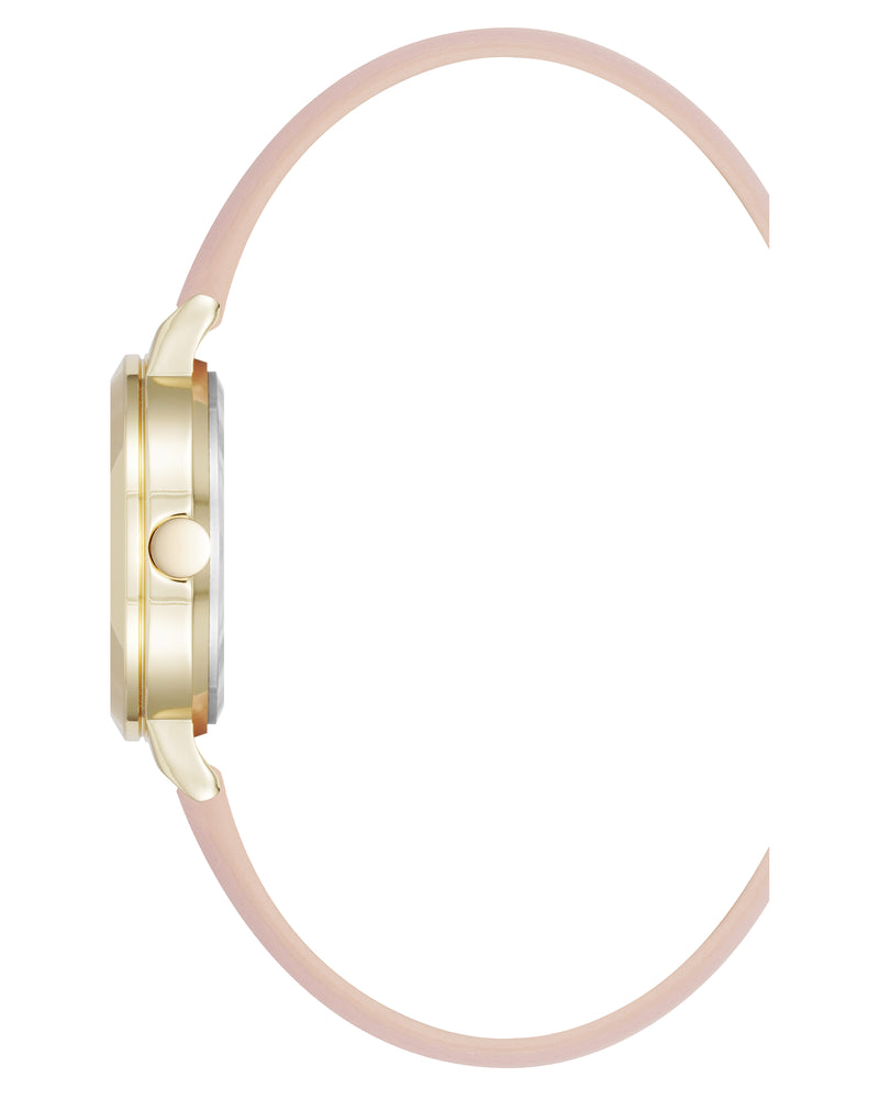 Product Details:Case: Gold Tone Round (32mm x 39mm)Dial: Silvery WhiteBezel: Gold ToneIndex: Sticks w ArabicBand: Pink Vegan LeatherClosure: BuckleWR: Splash Resistant