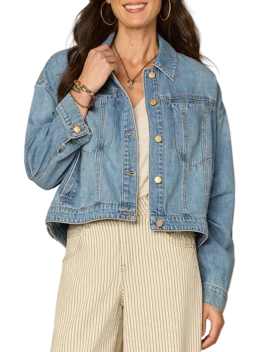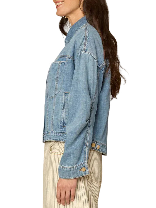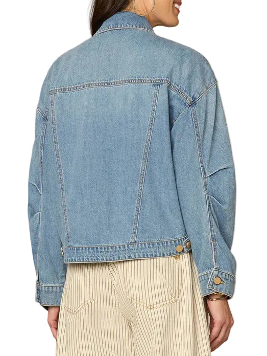 Double up the denim in this classic light blue denim jacket. It features long oversized barrel sleeves, a collar neck, button down front, welt pockets, and a hi-low hem.