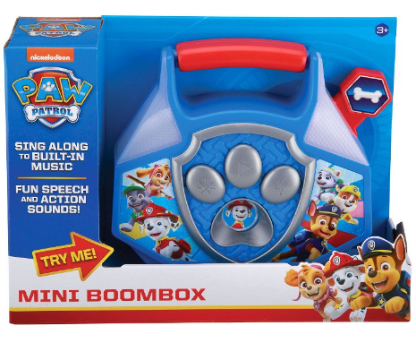 Paw Patrol Boombox to the rescue! With cool and colorful graphics inspired by the popular Nickelodeon show, this Paw Patrol toy is sure to please any little pup. The kid friendly, easy to use controls are specially designed for kids aged 3 and up. Packed with built-in music, sound effects, and flashing lights, this kids boombox has everything you need for a day of fun!