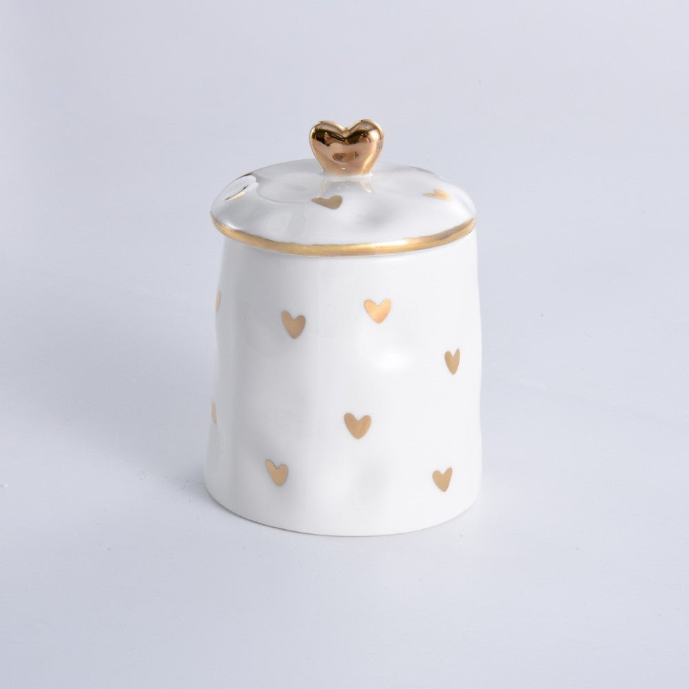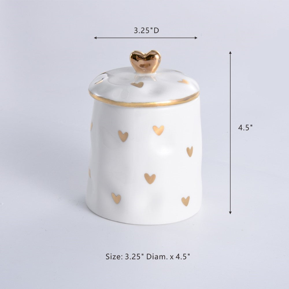 Covered Sugar from Pampa Bay's Heart to Heart Collection. The perfect everyday covered sugar holder is designed for relaxed meals with friends and family. Works equally well with jam, honey, mustard, and other condiments. Or keep this gorgeous container on your shelf, vanity, or bathroom counter to hold everything from cotton balls to buttons to earrings! Gorgeous white porcelain with delicate gold-tone decorations. Food safe, dishwasher safe, oven safe to 500°F. Easy Care.