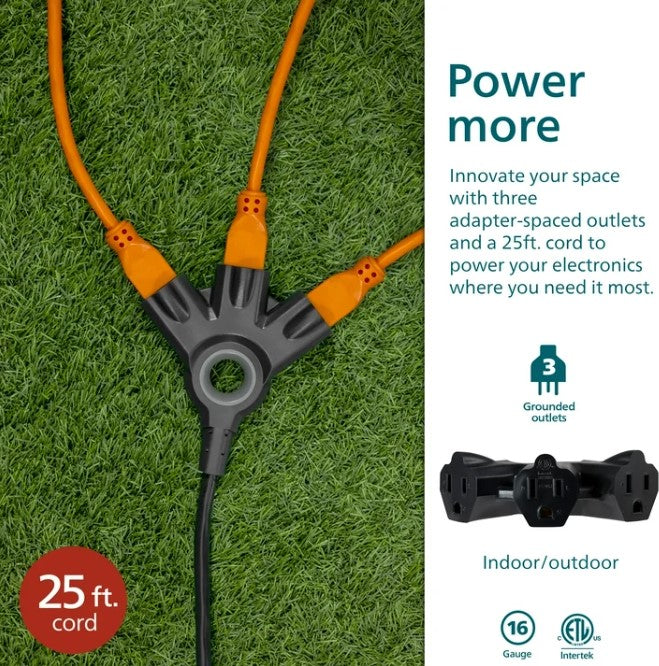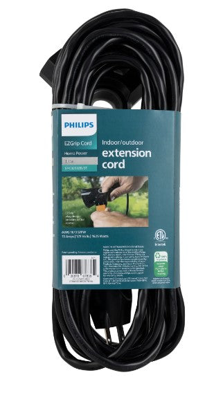 Get a grip on your electronics with the Philips EZGrip Extension Cord. Featuring three grounded outlets, this innovative extension cord extends the output of any grounded AC outlet. The revolutionary design of the EZGrip extension cord includes built-in ergonomic handles, making it easy to attach and disconnect electronics properly and safely. Use this versatile cord outdoors for power tools, patio lights or yard decorations. This cord is also rated for indoor use to power your electronics, appliances, and mobile devices. The dynamic 25ft. range of this cord makes extending the reach of your outlet effortless. This heavy-duty outlet extender is constructed of 16-gauge cable housed in a durable PVC insulation and jacket that make it strong enough for the toughest jobs but pliable enough to fully extend with ease. The black finish of this cord allows it to blend in with existing cords and cables. For the ultimate in safety and performance, look no further than the Philips EZGrip Extension Cord.