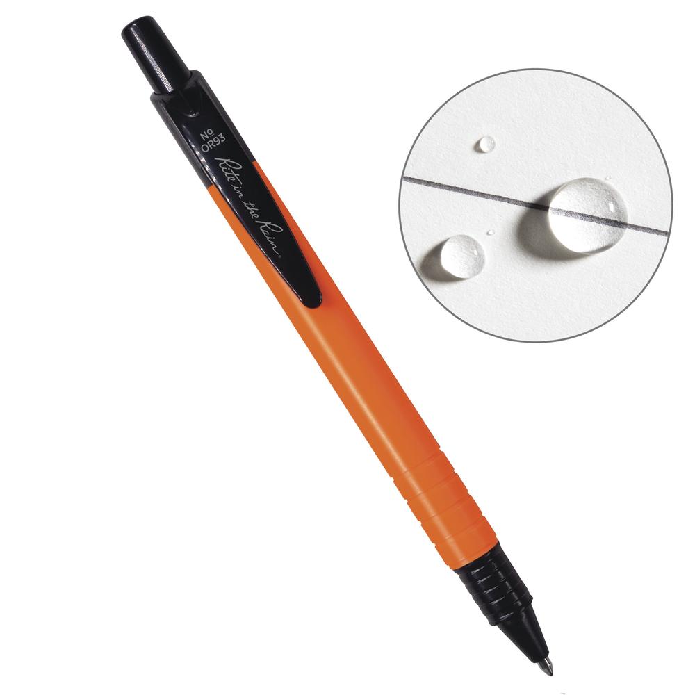 Pencils will work great on Rite in the Rain All-Weather Paper but sometimes you need a pen. This All-Weather Plastic Clicker Pen writes on wet paper and upside down, the pressurized ink cartridge performs in temperatures from -30F to 250F. Pen holds steady in wet conditions with the rubberized grip. The ink won't leak, evaporate, or blow up in your pocket. 5 1/4" long, with a Barrel Diameter of 3/8". Orange barrel, grip channels near tip indicate ink color. Red ink.