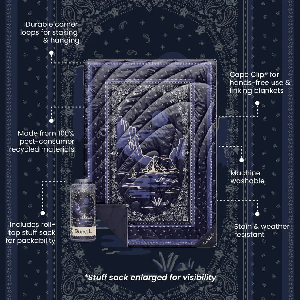 Meet the blanket that launched a brand – the original "blanket for everywhere," Rumpl's most iconic silhouette, and number one bestseller. Now in our Midnight Mesa Bandana print - Featuring a classic bandana pattern with western motifs in deep midnight blue.