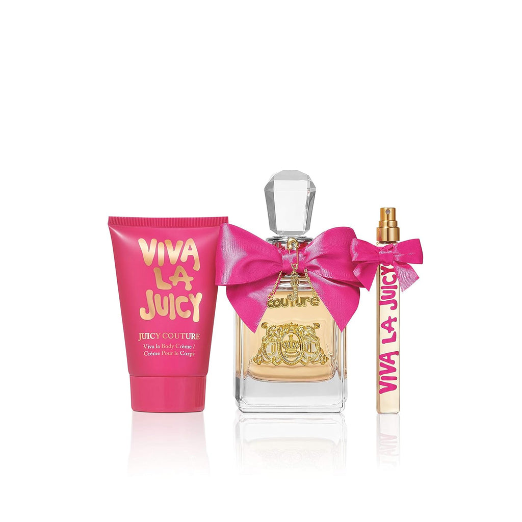 Juicy Couture Viva La Juicy 3 Piece Fragrance Gift Set, Perfume For Women. Long live the scent of couture. With top notes of wild berries and juicy mandarin gently tempered with honeysuckle, gardenia, and jasmine. Underlying it all are warm tones of.