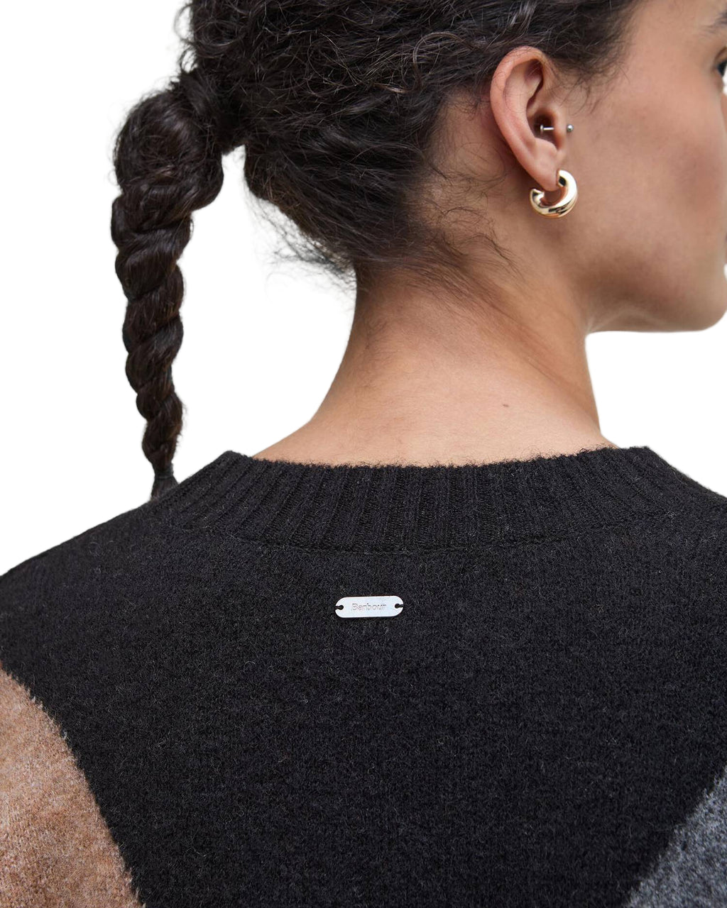 Make a statement in style with the Barbour Sabrina Crew Neck Jumper. Crafted from a premium wool-rich blend, this bold tri-color jumper features a jumbo diamond design all in neutral colorways making it an effortless styling option in the cooler months.