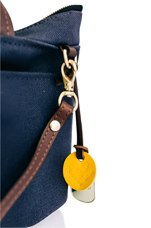 The Dot satchel features our classic natural + black vertical striped liner and iconic yellow support tag.