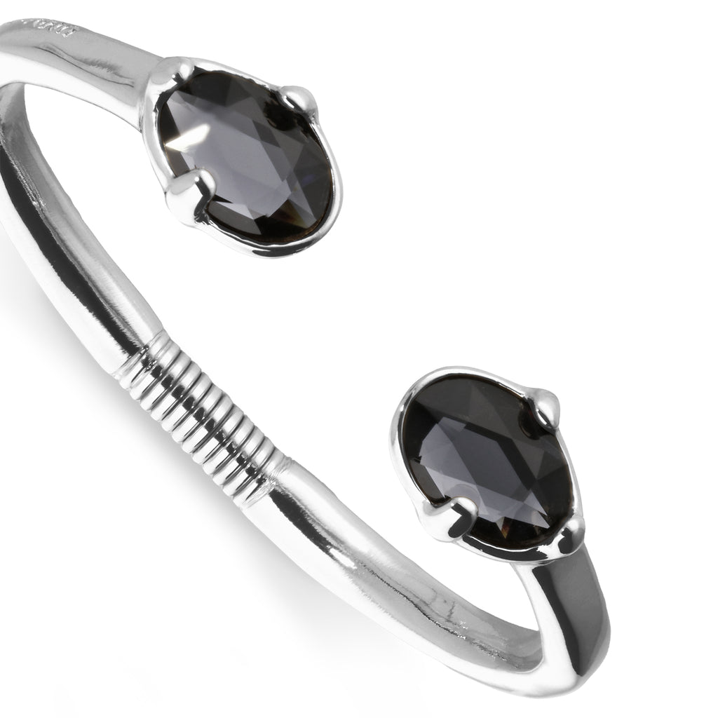 Rigid bracelet of metal alloy plated in sterling silver and grey faceted crystals at the ends