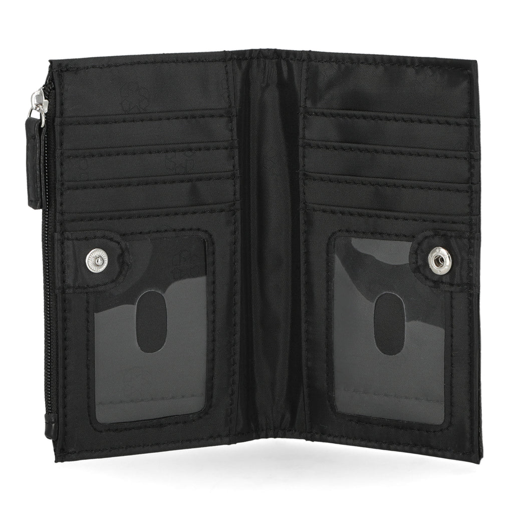 Keep your essentials organized in style with this sleek faux leather slim-fold women's wallet from Mundi. It has multiple card slots, zipper and slip pockets, a snap closure, and RFID-blocking technology.