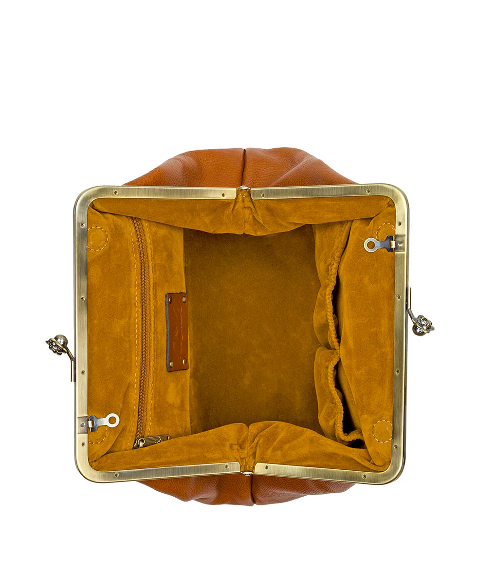 Love your look with this frame bag that embodies of vintage flair and modern design. Crafted from full-grain leather, its convenient size and structured silhouette make it elegant and eye-catching. The classic kiss-lock closure adorned with delicate rosebud clasps offers a romantic, nostalgic touch while keeping your essentials secure. Whether you're dressing up or adding flair to everyday wear, this timeless piece carries it all in unmistakable style.