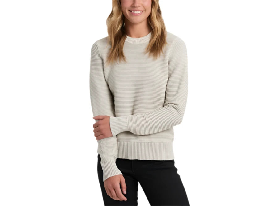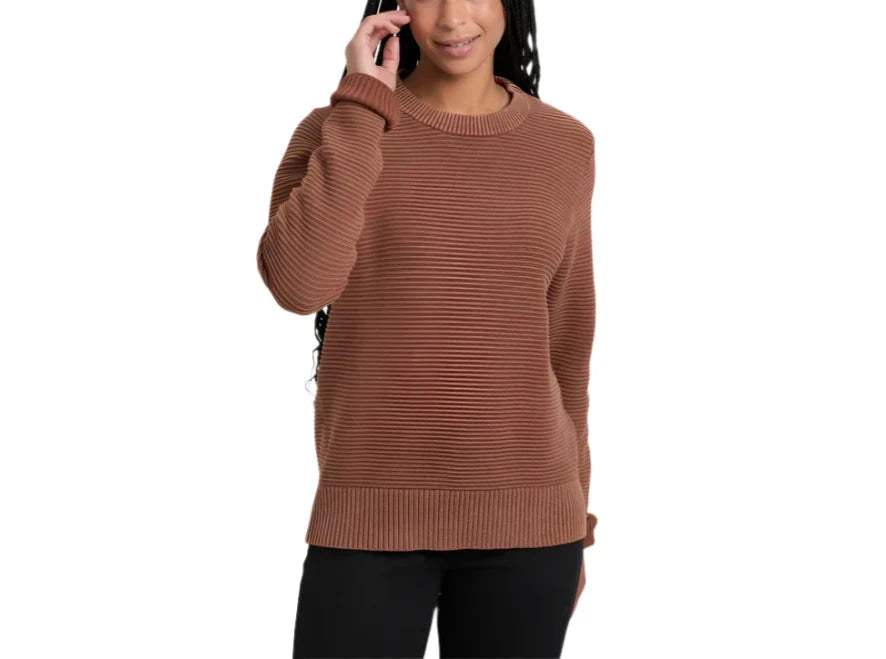 The soft, sustainable comfort of 100% organic cotton pairs with a stylish Ottoman knit for cozy, layering warmth and versatile everyday wear. Featuring a classic crew neckline and a relaxed fit, the garment dyed SOFIE delivers a unique look that easily transforms from casual to classy.