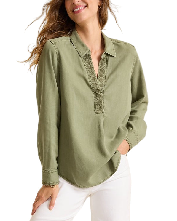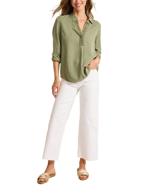 A unique sun-washed pigment treatment emphasizes the relaxed vibe of this airy linen-blend top, finished with an intricately embroidered placket and chic pointed collar. Perfect for effortlessly styling with denim on a brisk autumn day.