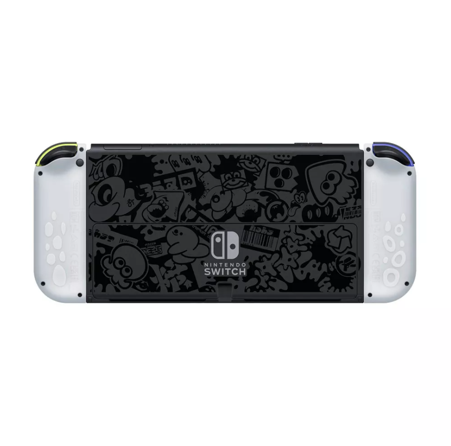 This Nintendo Switch system takes on a totally fresh look from the new Splatoon 3 game. Ink up the Splatlands in style with this Splatoon themed Nintendo Switch – OLED Model system! Fresh features include; blue and yellow gradient Joy-Con controllers with a white underbelly, a white dock adorned with graffiti, and a splat-tastic design on the back of the system. Game not included.
