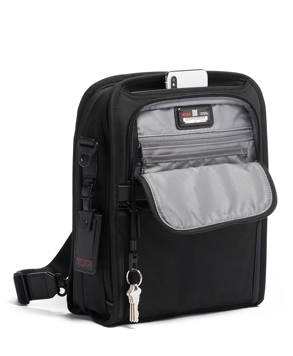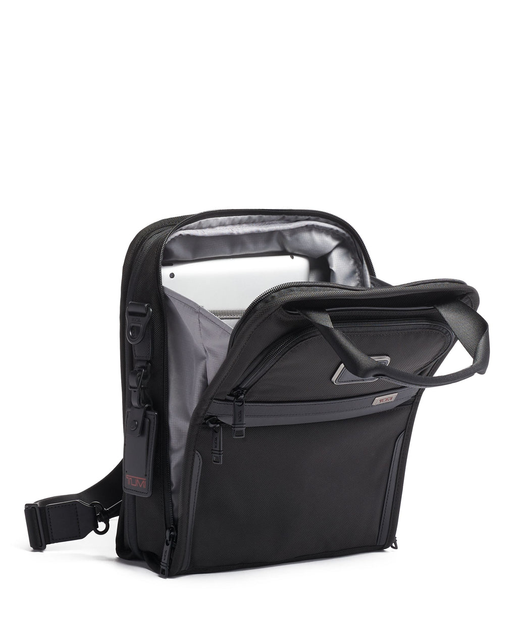 Adjustable back strap can be used to carry bag sling-style and tucks into back slip pocket when not in use