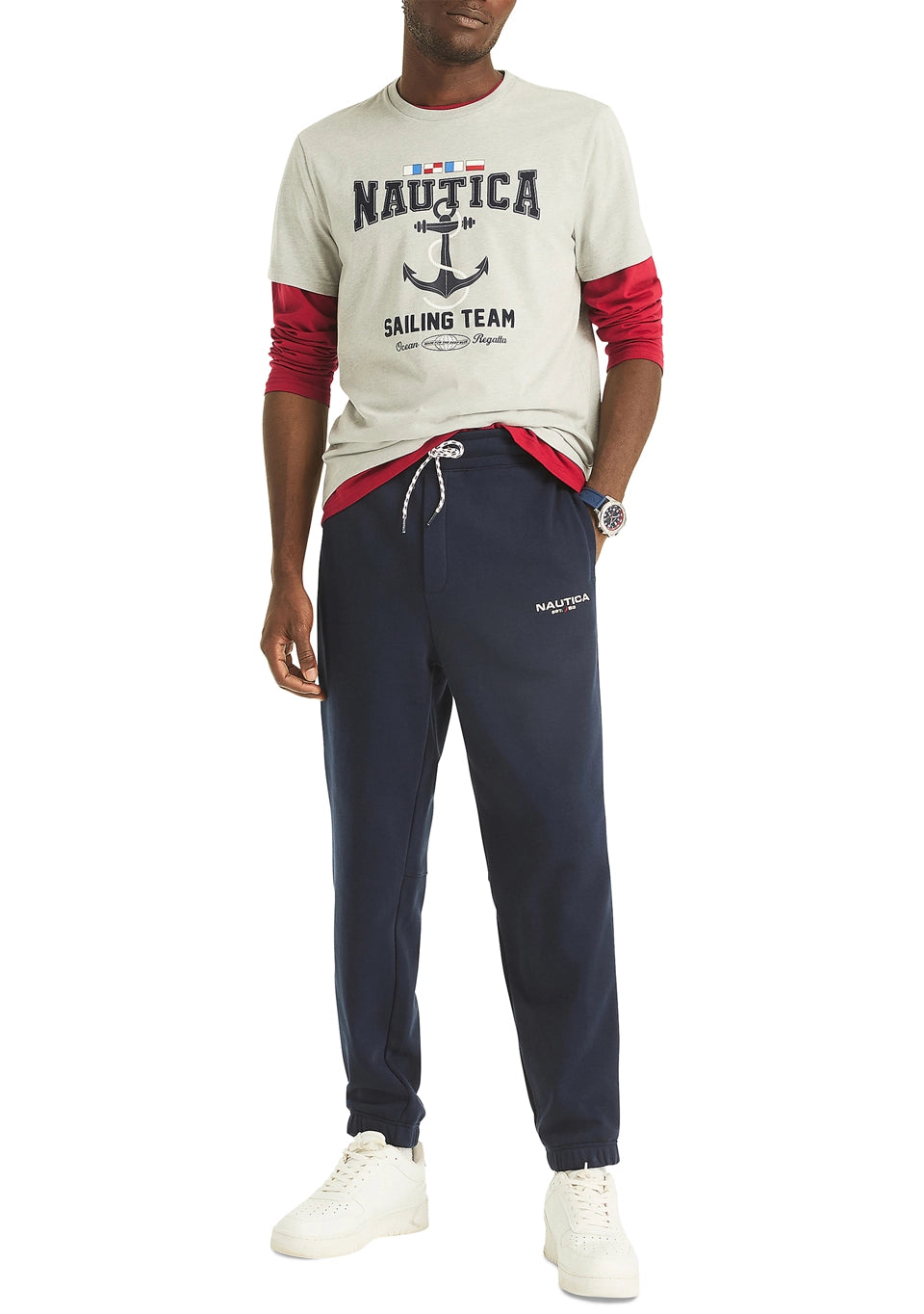 This crewneck t-shirt features a classic sailing-inspired Nautica logo graphic on the front.