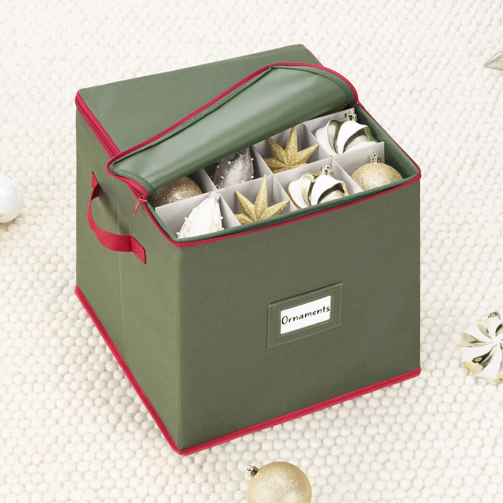 Store and protect your ornaments and holiday decor with Whitmor's Christmas Ornament Storage Box. A fashionable yet practical storage solution for your fine ornament collection. The fashionable organization box is made of a red PPNW fabric with contrasting green trim. This 13 x 13-inch cube features a removable top, convenient handles, and 64 separate compartments for individual ornament storage.