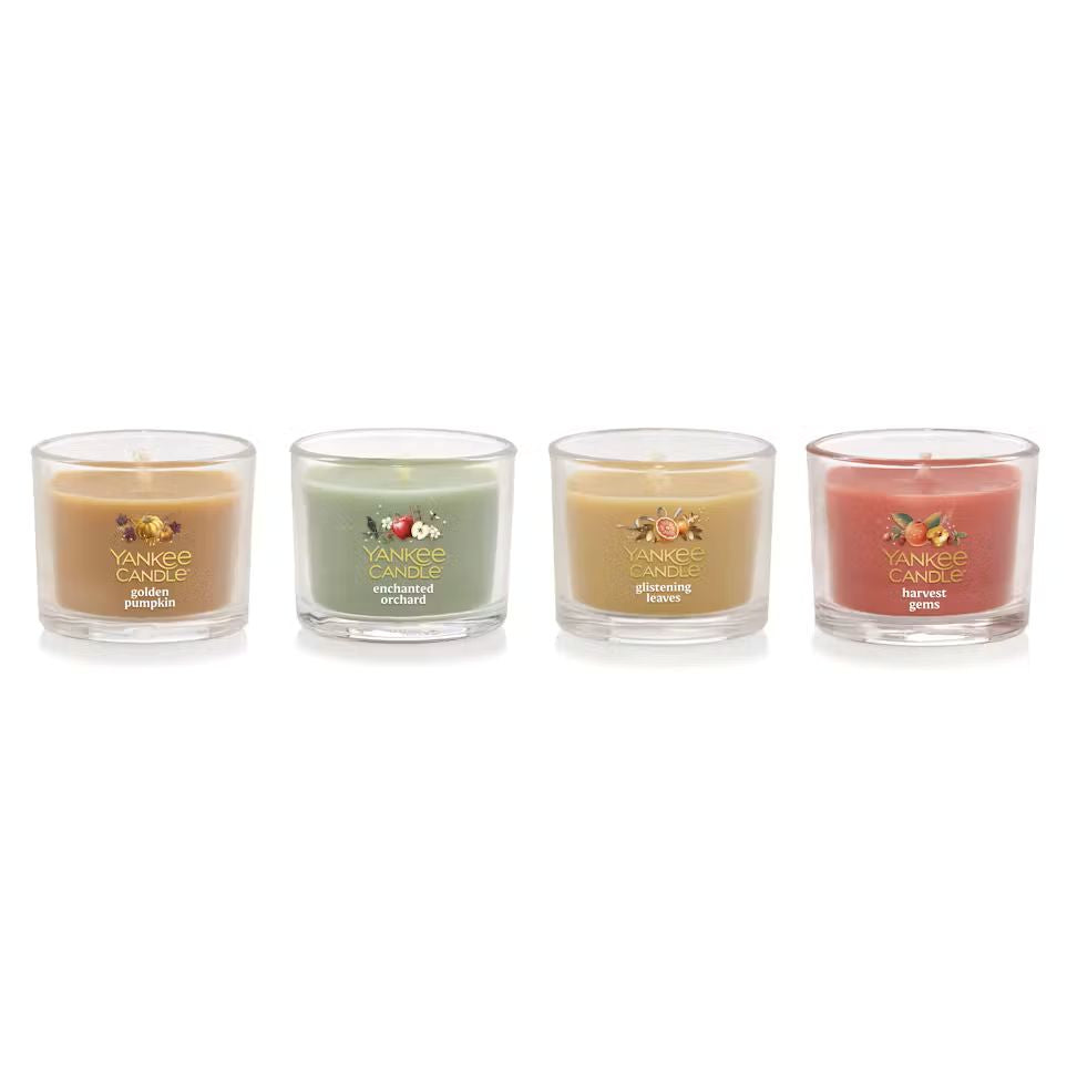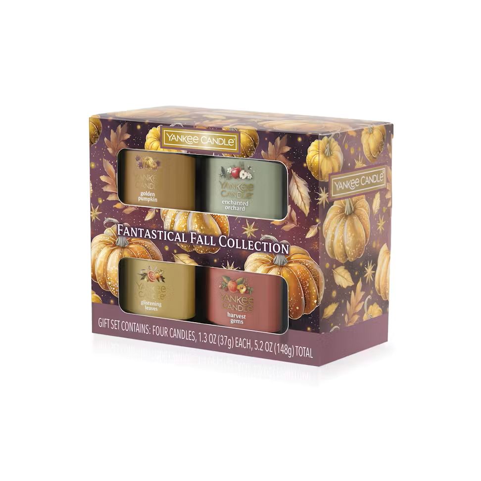 Experience the new Yankee Candle autumn fragrance collection, Fantastical Fall, with a charming set of four Yankee Candle Minis, one each in Golden Pumpkin, Enchanted Orchard, Glistening Leaves, and Harvest Gems. Golden Pumpkin - Basking in the afternoon sun, aromas of ginger, warm cinnamon, and sweet caramel waft from a mysterious patch of gilded pumpkins that almost seem to glow in the light. Enchanted Orchard - Venture into an enchanted orchard filled with mystery, magic, and the alluring fragrances of sliced caramel apples, brown sugar, and apricots. Glistening Leaves- Glistening golden leaves dance in the cool autumn breeze, carrying scents of sparkling citrus, oakmoss, and patchouli through the air. Harvest Gems - Autumn abundance: scents of ruby red berries, golden peaches, and a dazzling harvest of shining gemstone fruits.
